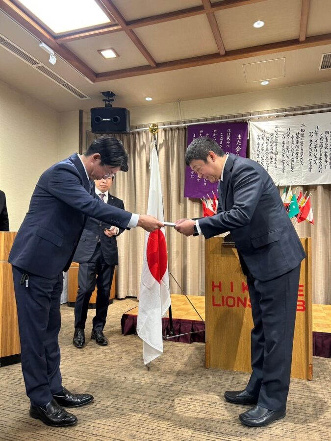 市田会長より、入会証書とバッジを受け取り、少し緊張した表情の新入メンバーです。