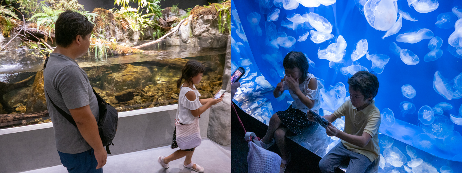 その後、約1時間半ほど自由散策。小さな子たちと魚たちの目線の高さを意識されているかのようなディスプレイが印象的で、お子さんたちが興味津々にカメラを向けていました。