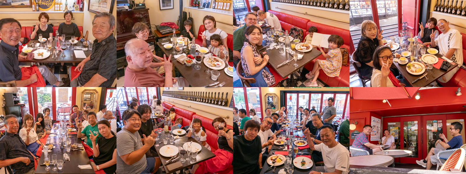 ランチコースが次々と運ばれ、歓談する家族、メンバーら。