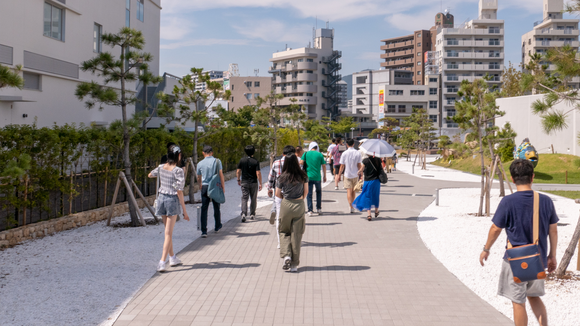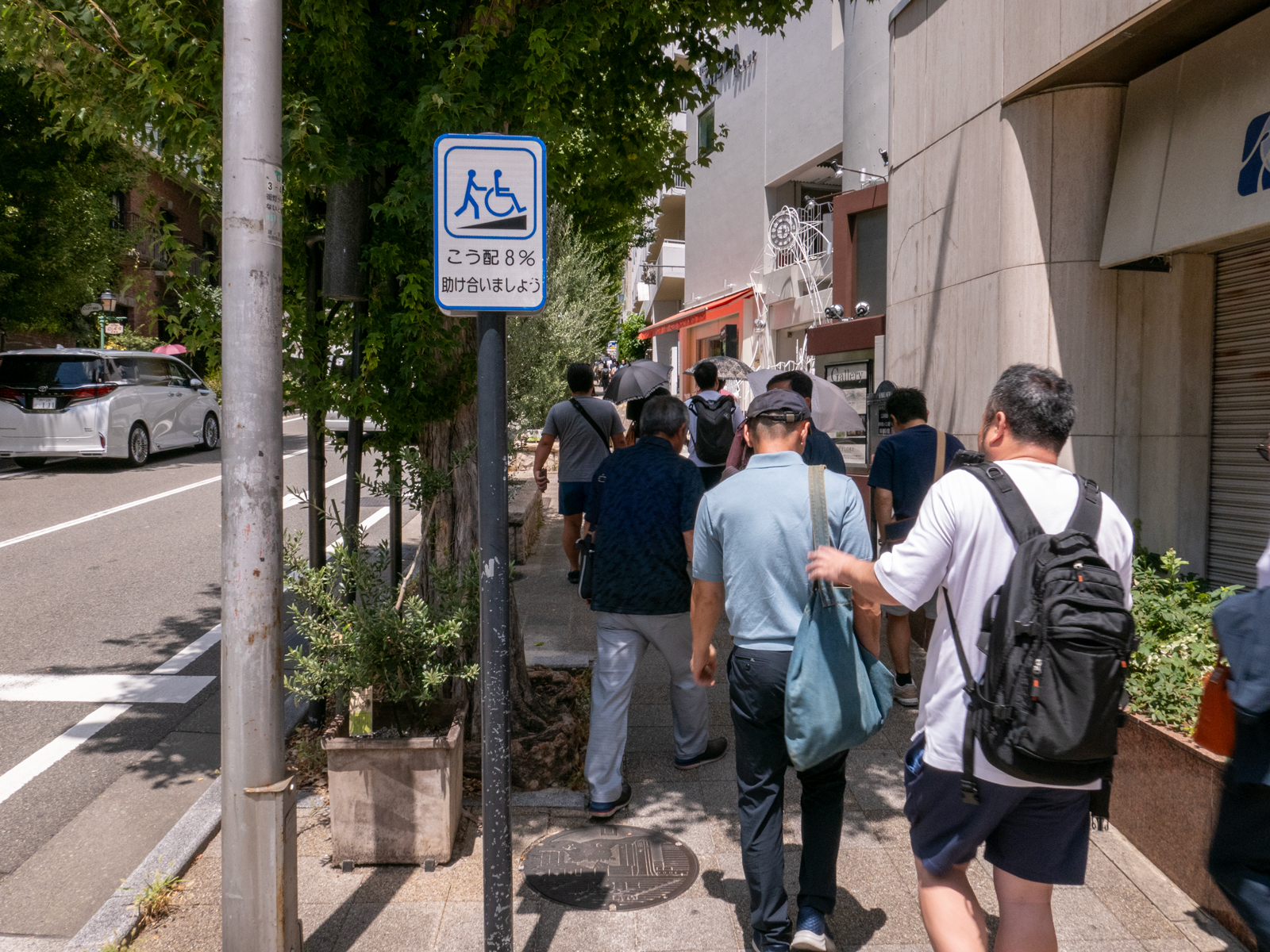 エントランスのモニュメント前で撮影しようにも、この日の気温は36℃。暑い暑いと言いながら、参加者全員で記念撮影。