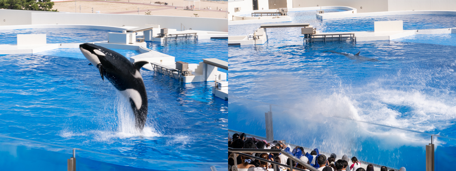 イルカよりもひと回り大きな体の2頭のシャチが、器用ながらも迫力あるパフォーマンスを披露。多くのお客さんがビショビショになってました。